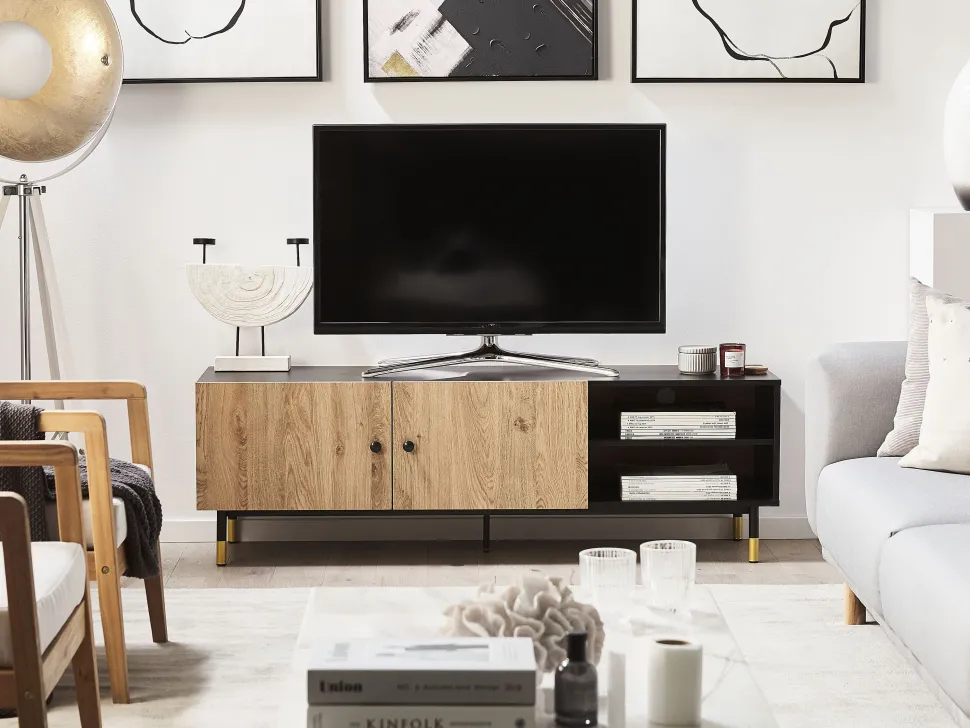 Be the first to review “Movel De Tv Com 2 Portas E 2 Prateleiras Em Madeira Clara E Preta Abilen” Cancelar resposta