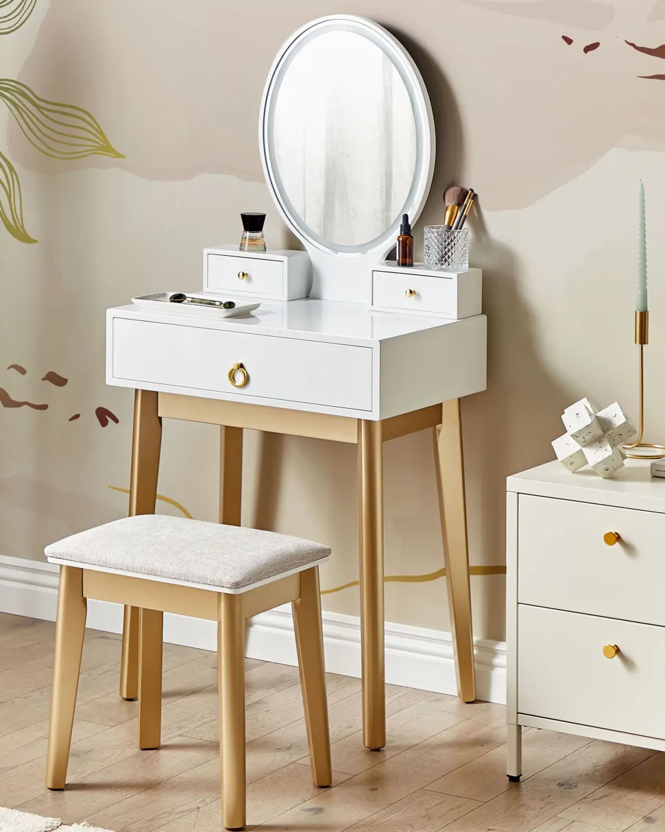Be the first to review “Toucador Com 3 Gavetas E Banco Branco E Dourado Rosey” Cancelar resposta